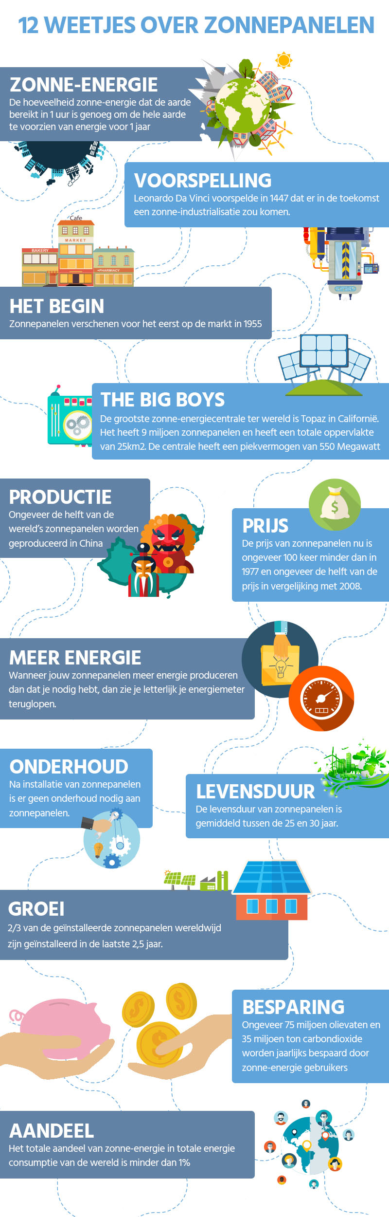 Om even een pauze te nemen tijdens de lange zoektocht hebben wij voor u een infographic gemaakt. Hierin kunt u onder andere lezen over waar zonnepanelen vandaan komen en waar de grootste zonne-energiecentrale van de wereld is gevestigd.